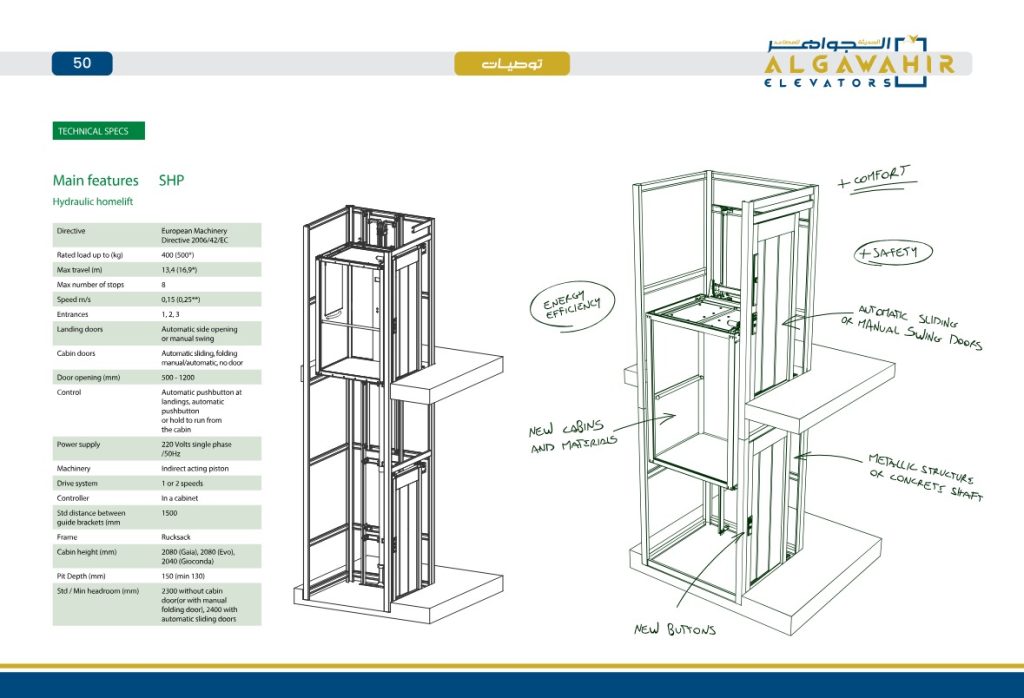Energy Efficiency (كفاءة الطاقة): استهلاك منخفض للكهرباء بما يتناسب مع الاستخدام المنزلي. Safety & Comfort (الأمان والراحة): التركيز على سلاسة الحركة ومعايير السلامة العالية. Automatic or Manual Doors: خيارات متنوعة للأبواب، سواء كانت أبواباً منزلقة أوتوماتيكية أو أبواباً يدوية (Swing Doors). Metallic or Concrete Shaft: يمكن تركيب المصعد داخل بئر خرساني جاهز أو ضمن هيكل معدني خاص. New Cabins and Materials: إشارة إلى توفر كبائن عصرية بمواد وخامات حديثة.